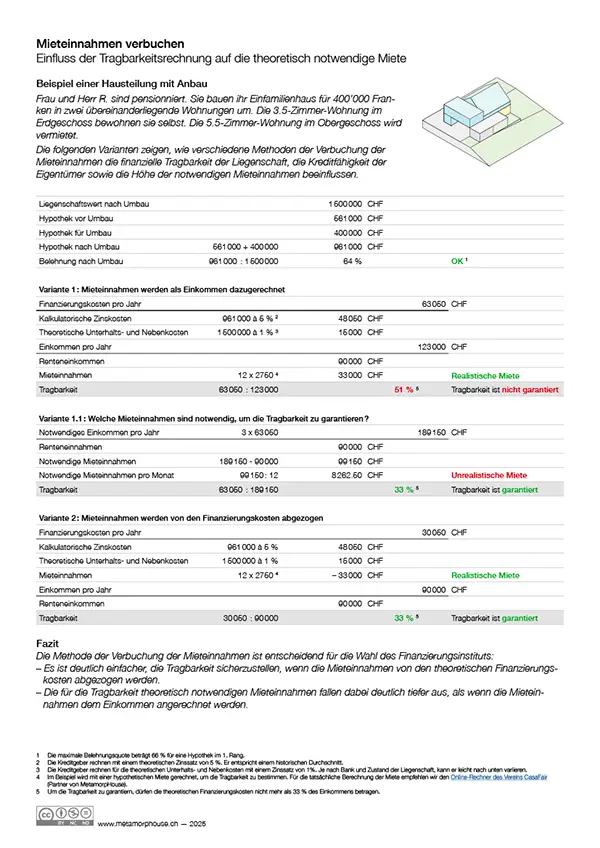 Die Methode der Verbuchung des Mietzins variiert von einer Bank zur anderen. Einige Banken rechnen die Mieteinnahmen zum Einkommen der Eigentümer hinzu, andere ziehen sie von den theoretischen Finanzierungskosten ab. Dieser Unterschied hat einen grossen Einfluss auf die finanzielle Tragbarkeit der Liegenschaft und kann bei der Wahl des Finanzierungsinstituts ausschlaggebend sein.